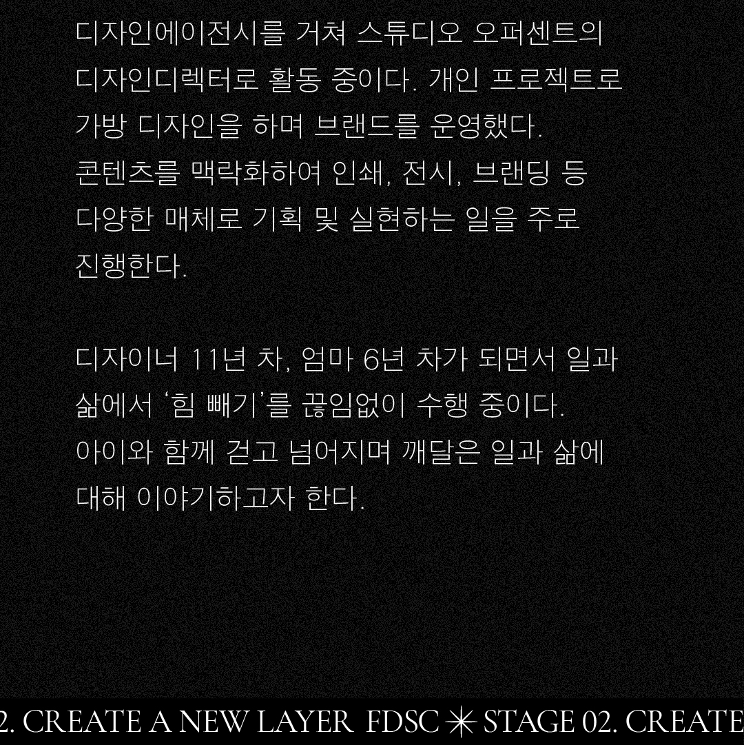 FDSC STAGE 02를 빛낼 세 번째 디자이너는 스튜디오 오퍼센트의 김나영 디렉터입니다! 김나영 디자이너는 콘텐츠를 다양한 매체로 기획하고 실현하는 능력이 뛰어납니다. 아이와 함께 걷고 넘어지며 깨달은 김나영 디렉터의 이야기가 궁금하다면 링크를 통해 확인하세요!