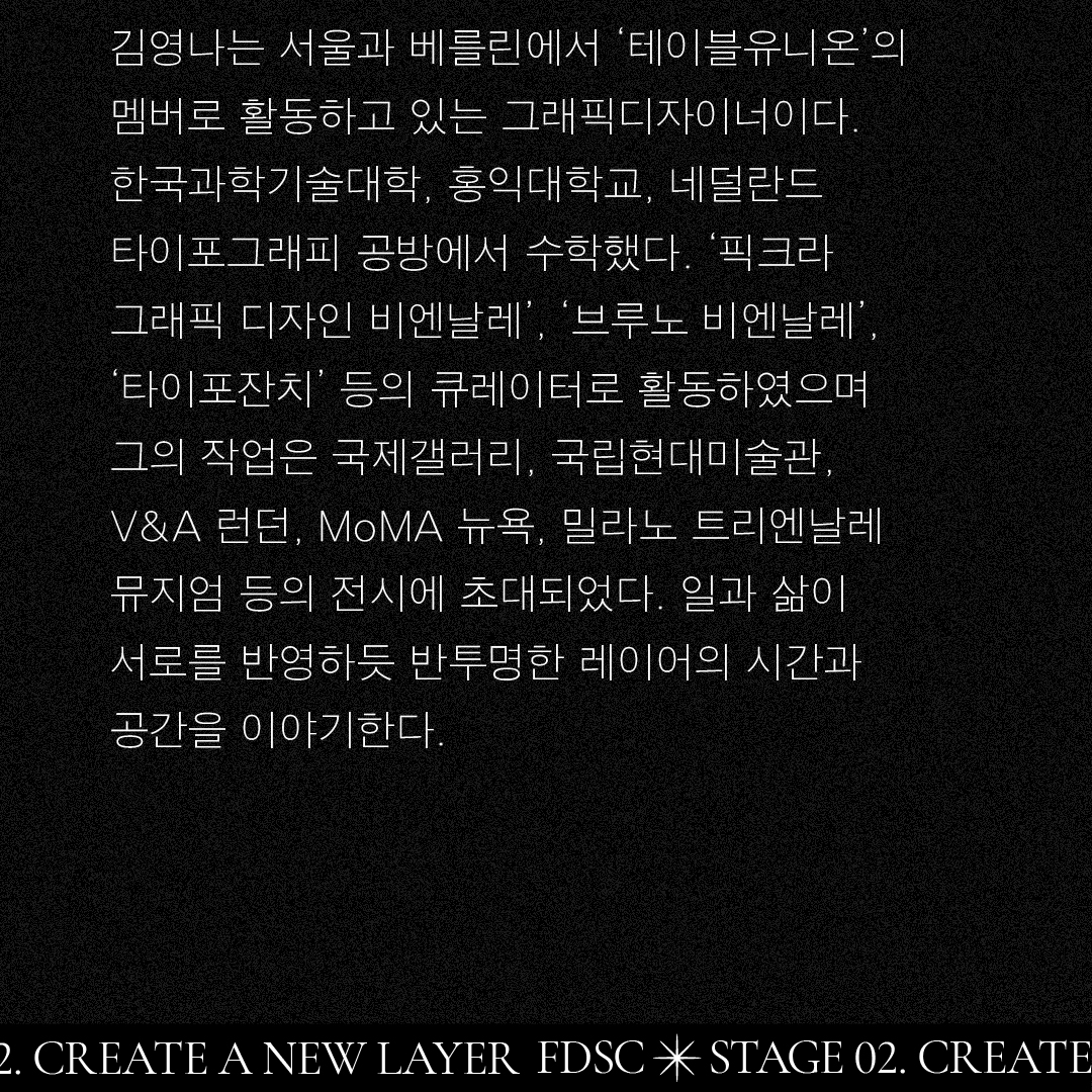 FDSC STAGE 02를 빛낼 마지막 디자이너는 ‘테이블 유니온’의 멤버인 김영나 디자이너입니다. 서울과 베를린을 오가며 바쁘게 일하는 그의 일과 삶을 들려줍니다. 반투명한 레이어를 통해 어떤 이야기를 들여다볼 수 있을까요?