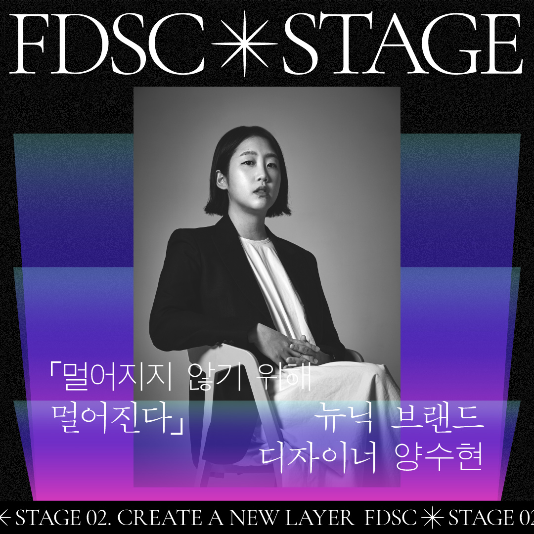 FDSC STAGE 02를 빛낼 첫번째 디자이너는 현대미술을 전공한 양수현 디자이너입니다. 양수현 디자이너는 뉴닉의 브랜드 총괄을 맡고 있으며 이번 페스테에서 ‘멀어지지 않기위해서 멀어진다‘는 주제로 이야기를 들려줍니다. 과연 무슨 의미일까요?