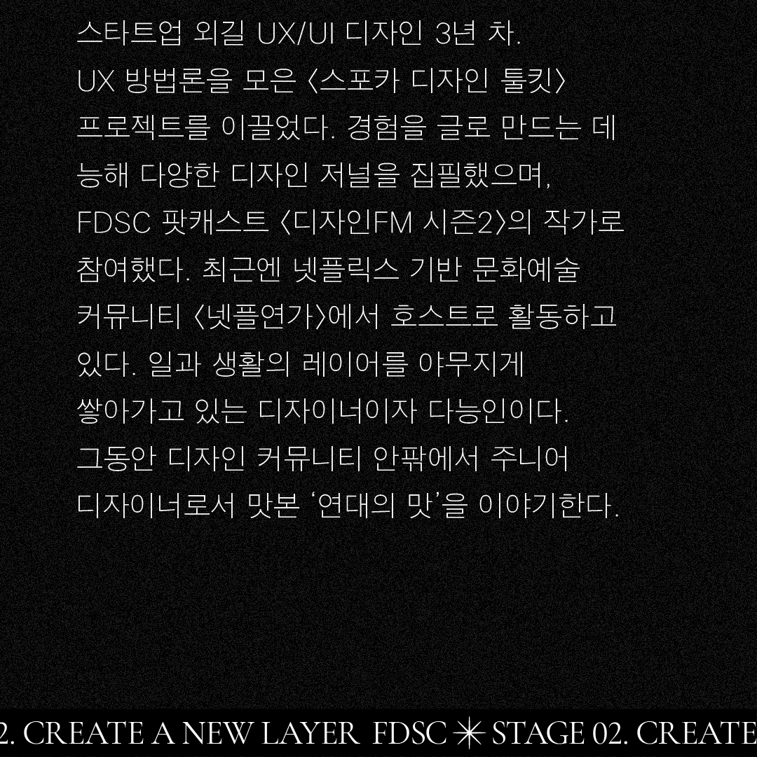 FDSC STAGE 02를 빛낼 두 번째 디자이너는 스타트업 외길을 걷는 유다정 디자이너입니다. 유다정 디자이너는 자신의 경험을 글로 만드는 멋진 능력이 반짝반짝 빛난다는데?! 유다정 디자이너가 맛본 연대의 맛은 얼마나 달콤한 걸까요? 10월 31일 확인하세요!