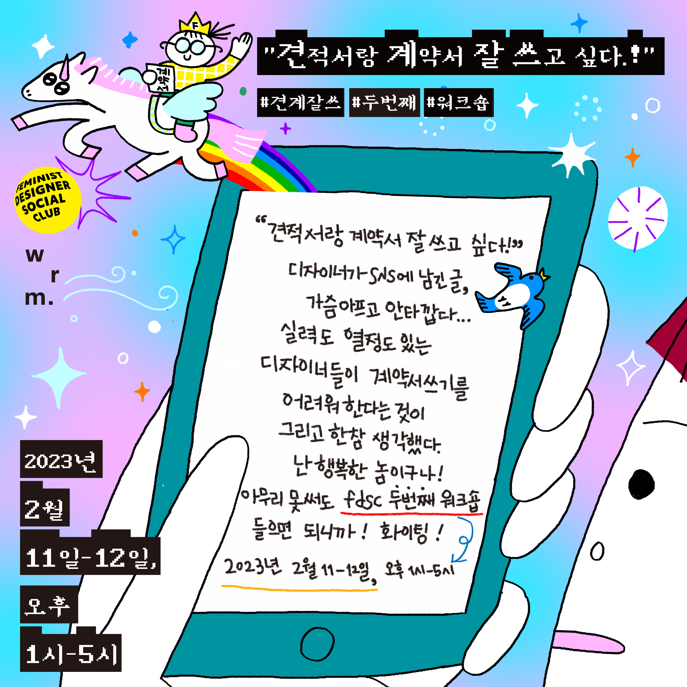 FDSC는 wrm의 지원을 받아, 2022년 12월에 이어 두 번째 #견계잘쓰 워크숍을 개최합니다. 법률사무소 아티스의 서유경 변호사와 함께 시각디자인 분야에서 견적서와 계약서를 둘러싼 법리 및 협상에 대해 배우는 참여형 워크숍입니다.