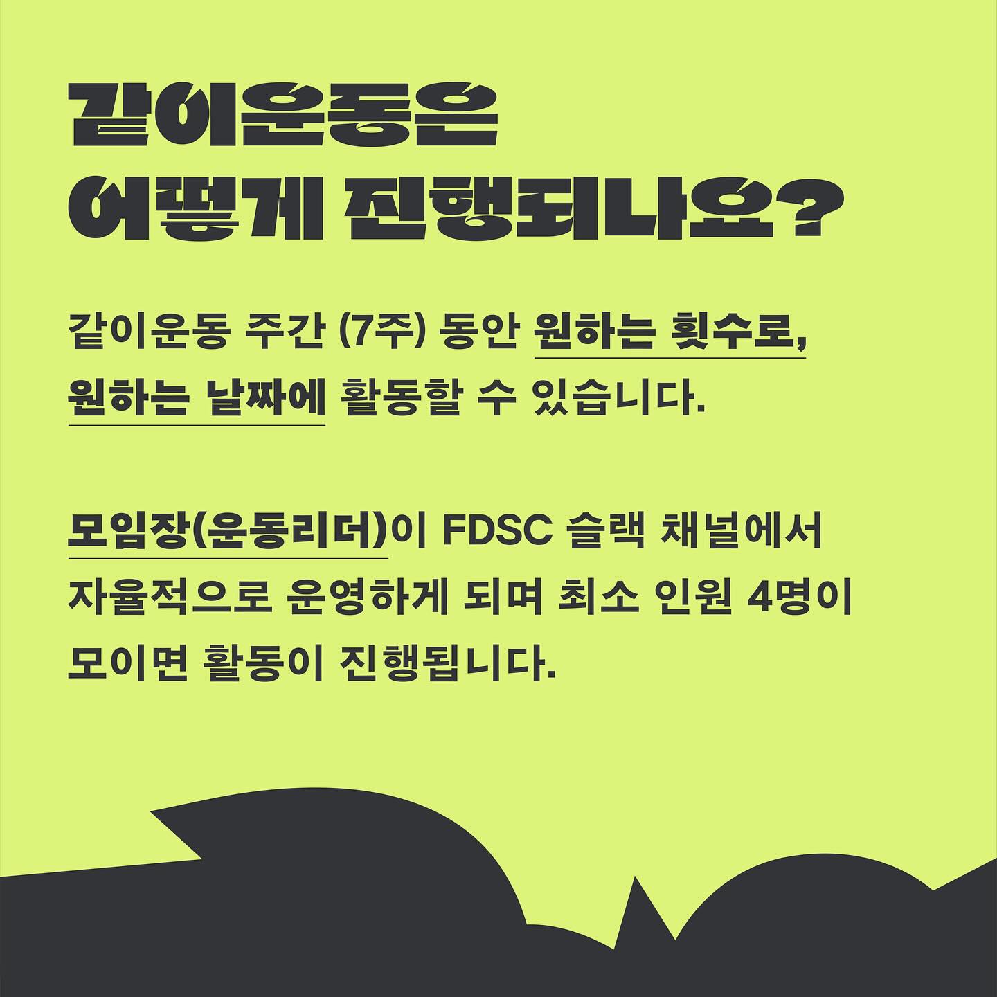 운동한마당 ‘같이운동’은 7주 동안 다양한 운동을 함께 진행하는 프로그램입니다. 종목은 러닝, 클라이밍 등 활동적인 운동부터 가볍게 즐길 수 있는 손가락 운동 등 다양한 종목을 진행합니다.