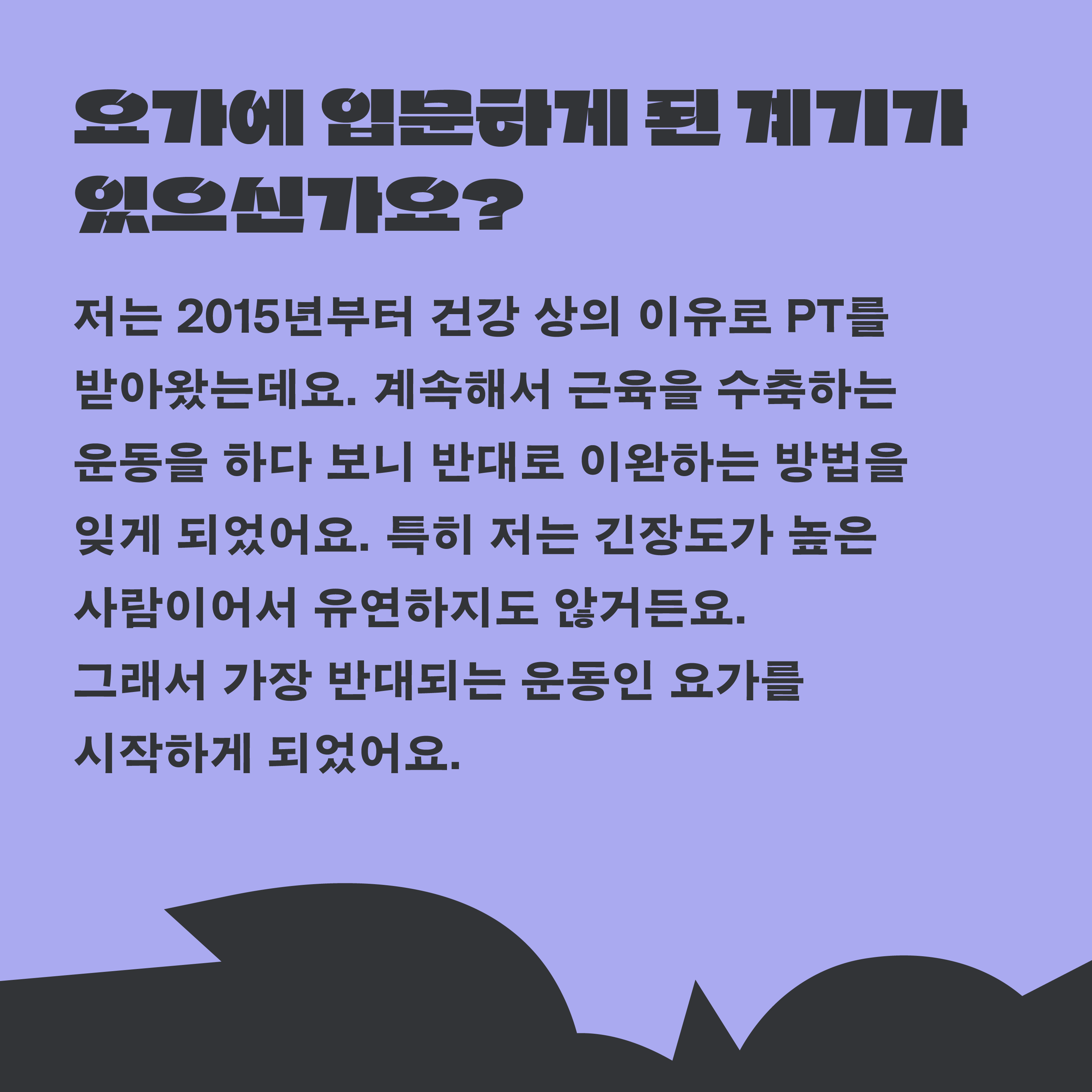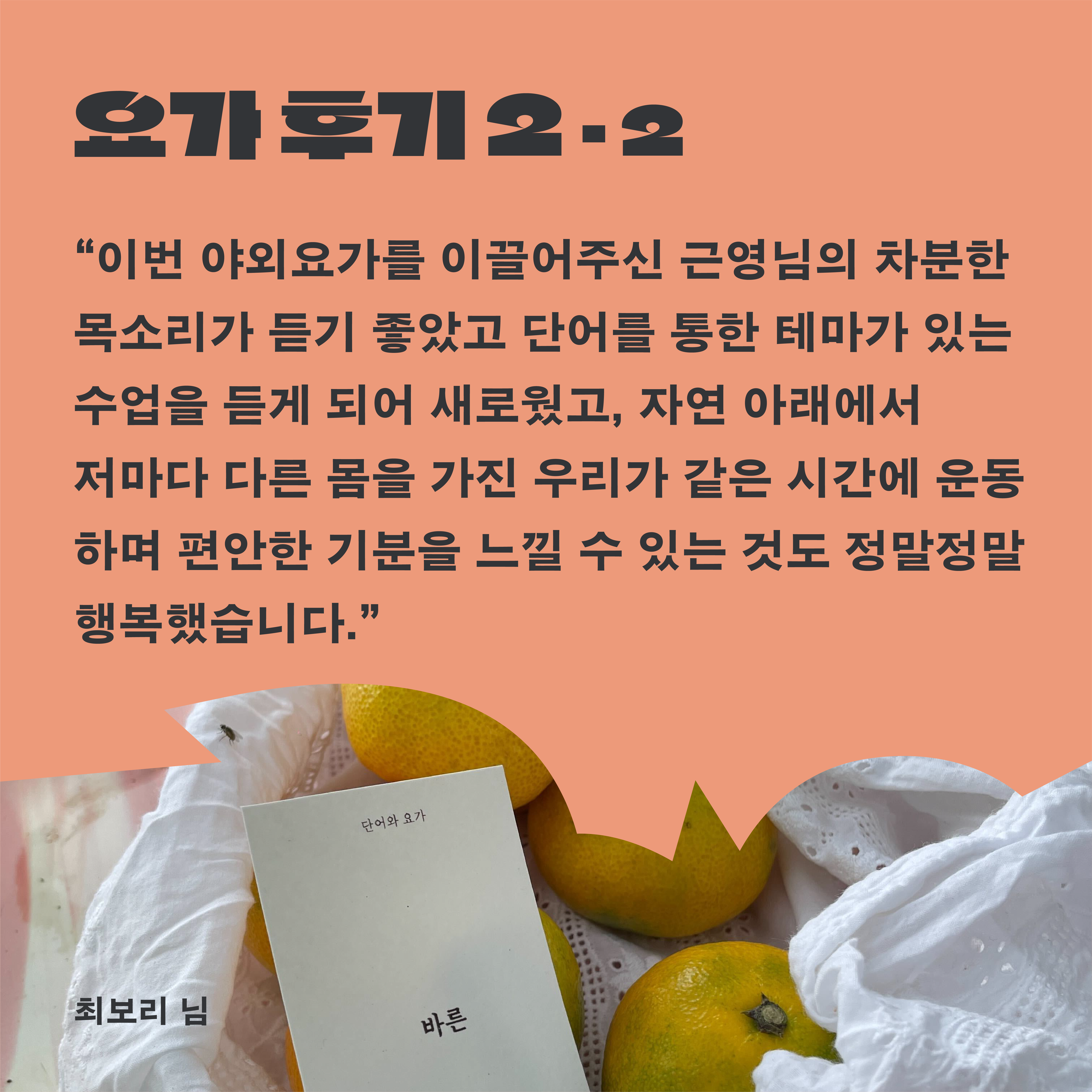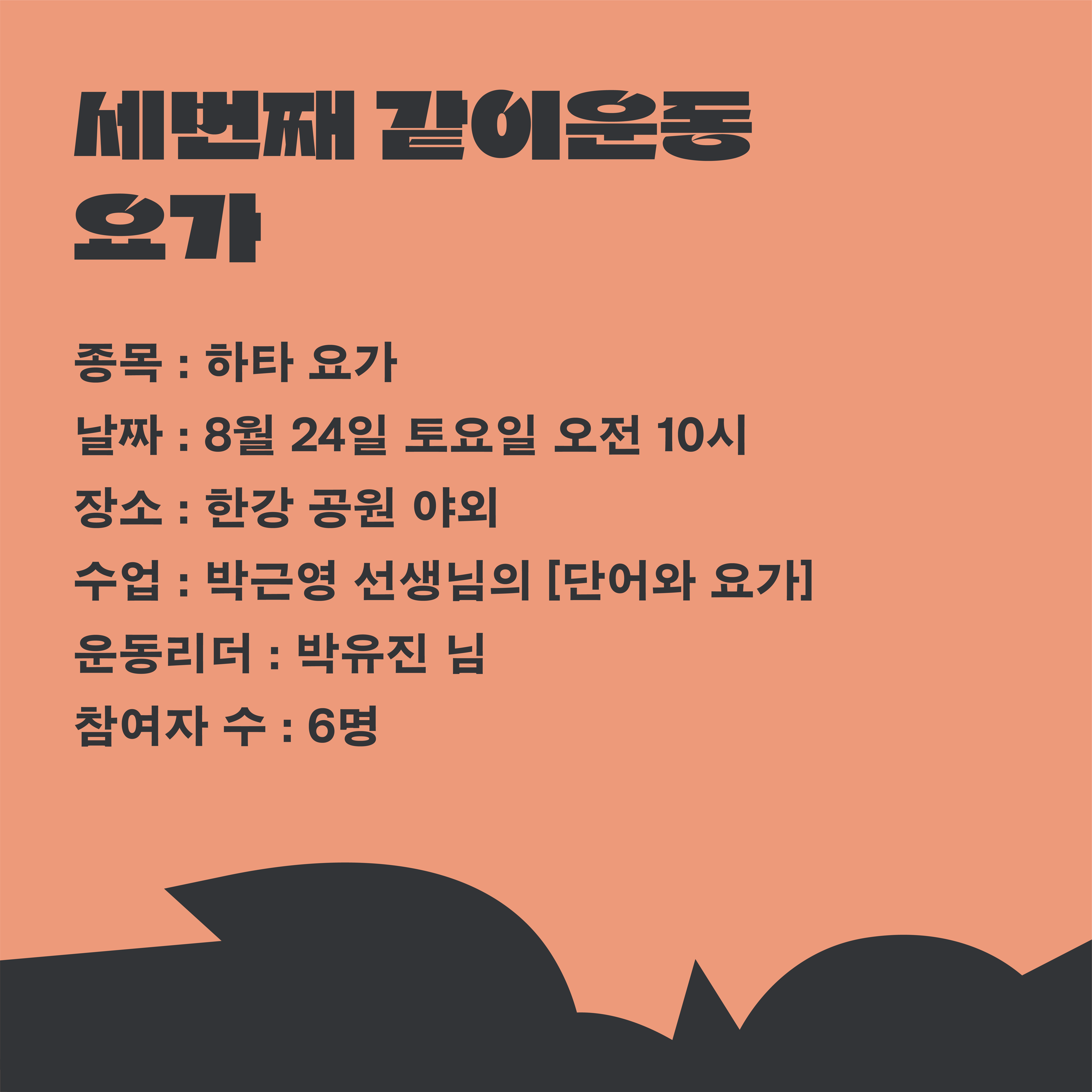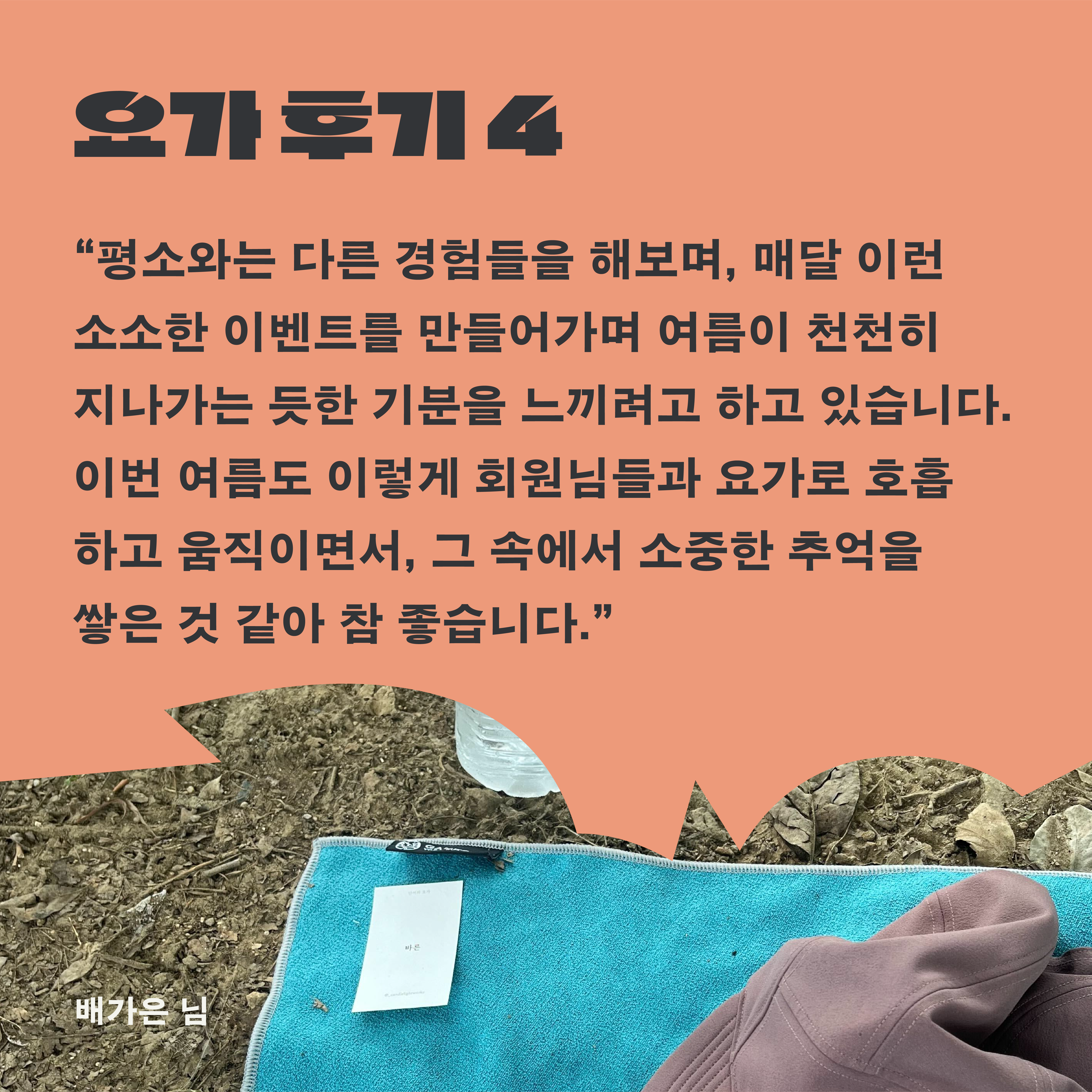 운동한마당 ‘같이운동’ 세번째 종목은 바로 요가였는데요! 이번 같이운동에서는 박근영 선생님을 모셔, 운동리더를 포함하여 6명의 회원님이 야외에서 요가를 진행했다고 합니다. 또, 운동한마당 ‘같이운동’ 세번째 운동을 열어주신 박유진 회원님과 인터뷰를 진행했습니다. 소감부터 운동템 공유까지 다양한 대화를 나눴습니다.