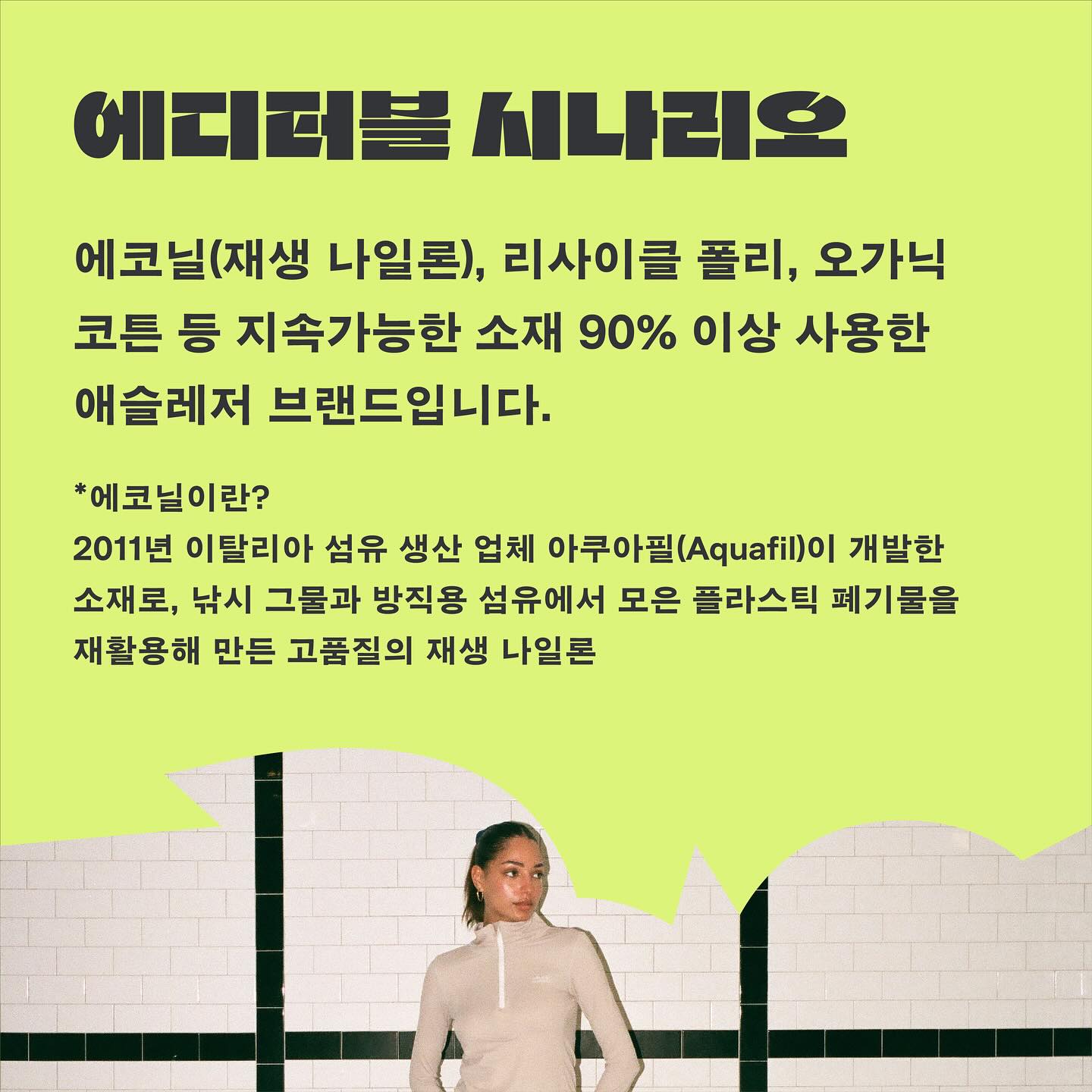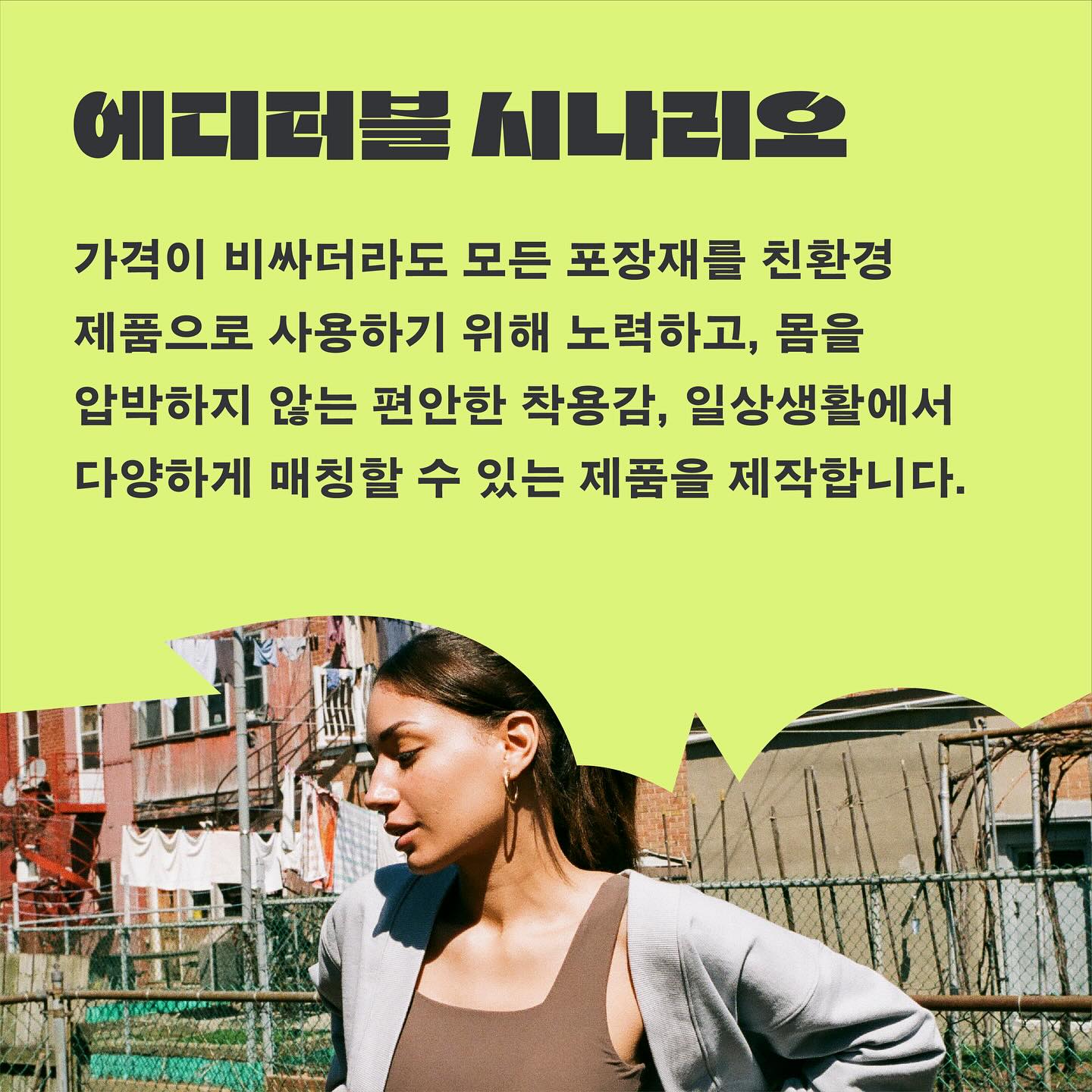 현재 FDSC 내에는 애슬래틱 브랜드를 운영하는 회원님들이 있는데요. 그 중 에코닐(재생 나일론), 리사이클 폴리, 오가닉 코튼 등 지속가능한 소재 90% 이상 사용한 애슬레저 브랜드 에디터블시나리오(@editable.scenario )와, 양수현 회원님의 편견에 맞서고 당당한 태도를 제안하는 브랜드 레디투킥(@areyou.readytokick )을 소개합니다.
