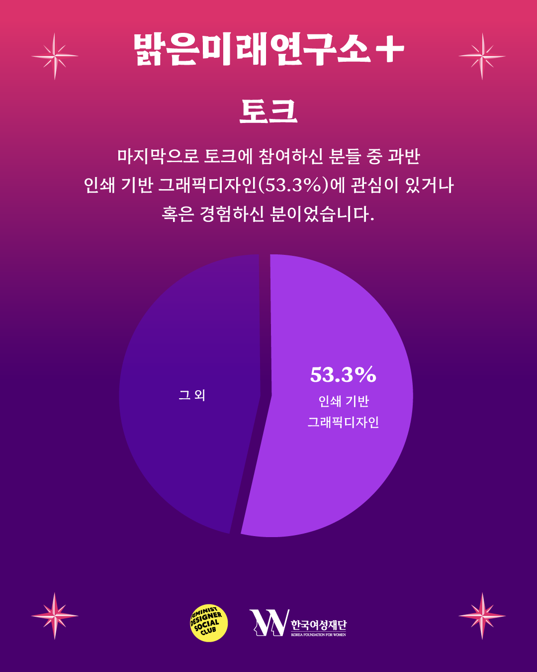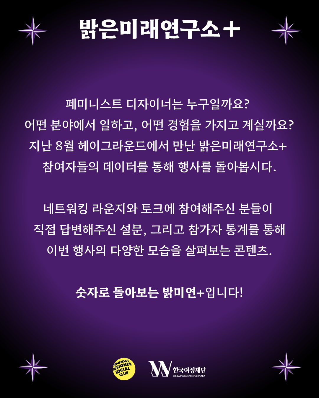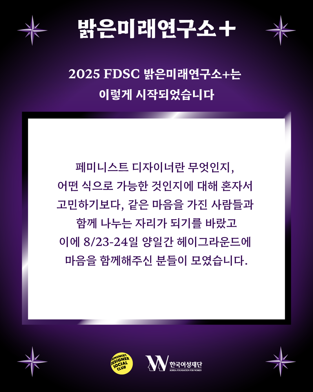 FDSC는 한국여성재단의 지원을 받아 총 24명의 멘토들 및 224명의 참가자들과 함께 시각디자인 분야의 예비/주니어 디자이너를 위한 이벤트 [FDSC 밝은미래연구소+]를 개최했습니다.
