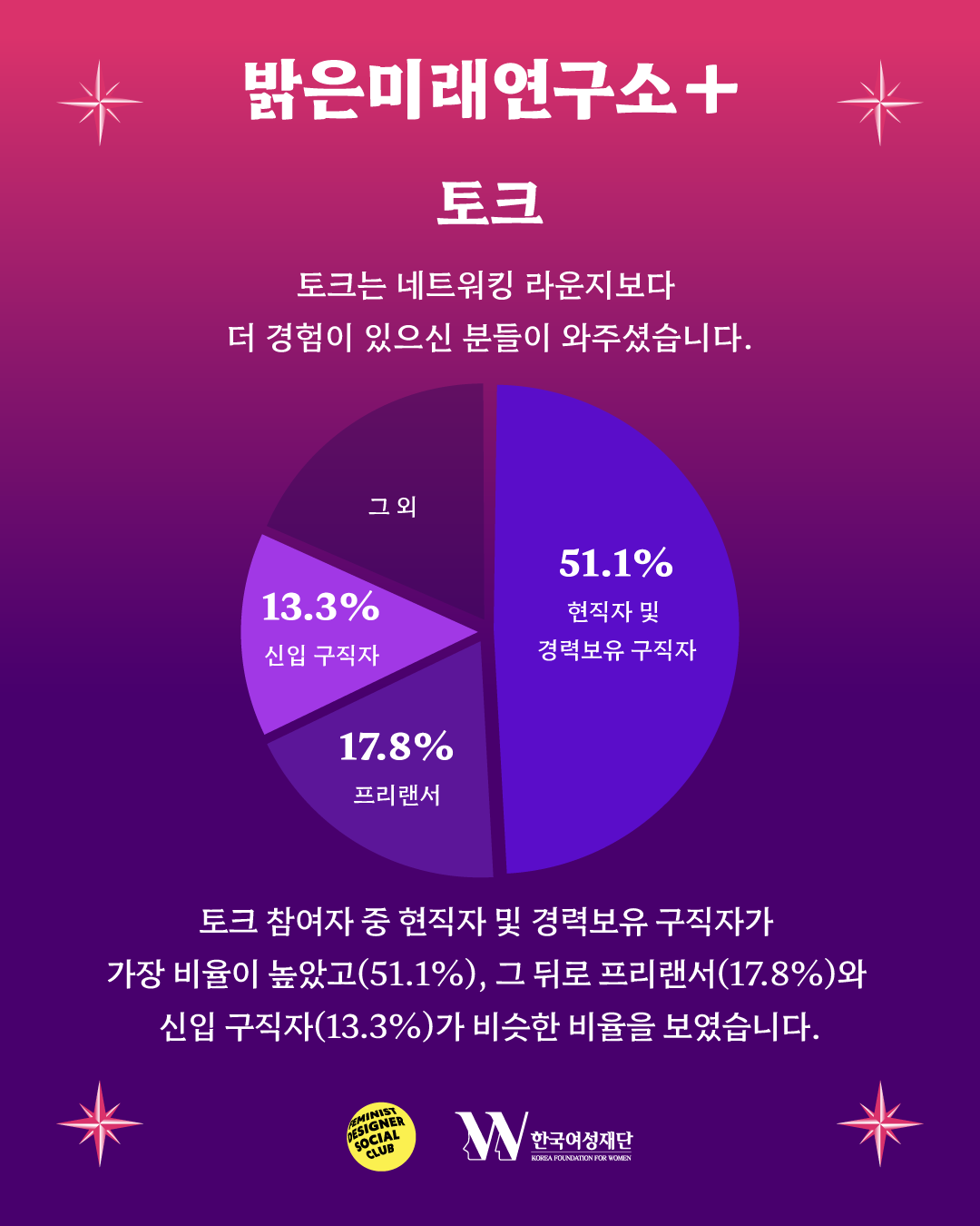 페미니스트 디자이너는 누구일까요? 어떤 분야에서 일하고, 어떤 경험을 하고 있을까요? 네트워킹 라운지와 토크에 참여해 주신 분들이 직접 답변해 주신 설문, 그리고 참가자 통계를 통해 지난 행사의 다양한 모습을 살펴보는 콘텐츠, 숫자로 돌아보는 밝미연+입니다!