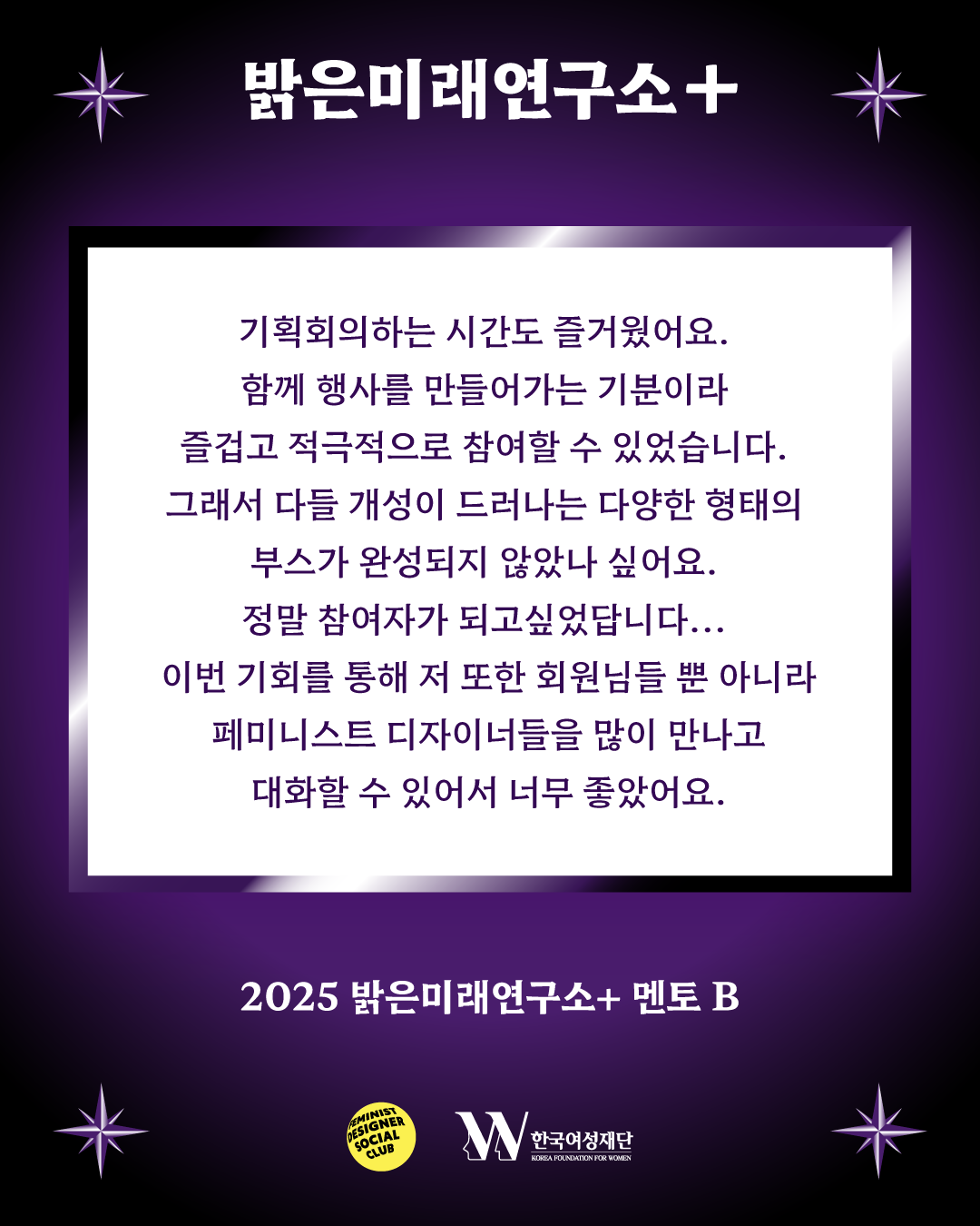 "페미니스트 디자이너로서 우리가 원하는 미래를 같이 그려보고 싶어요." 이런 마음으로 시작된 2025 밝은미래연구소+에는 예상보다 훨씬 다양한 분들이 모여주셨습니다. 멘토와 멘티, 학생과 현직자, 인쇄 그래픽과 UX/UI , 다양한 길을 걷고 계신 참여자들의 생생한 후기를 전하는 콘텐츠, 후기로 돌아보는 밝미연+입니다!
